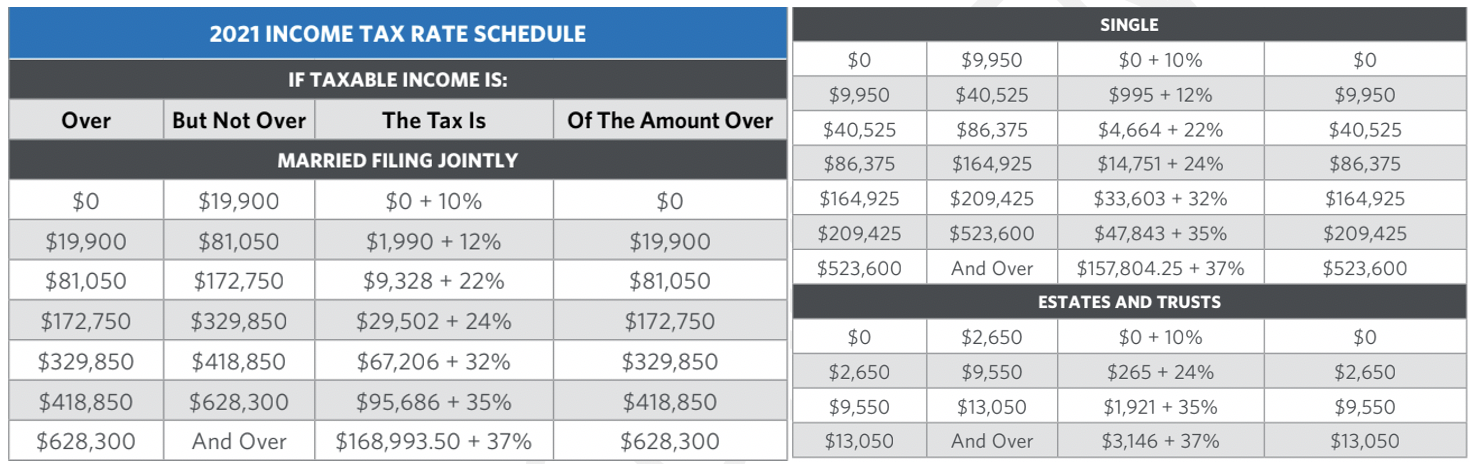 The income taxes are determined by applying a tax rate, which may increase as taxable income increases. For the 2021 tax year, there are seven tax brackets for most ordinary incomes: 10%, 12%, 22%, 24%, 32%, 35% and 37%. Generally, as you move up the paycheck scale, you also move up the tax scale. Your tax bracket also depends on your taxable income and your filing status : single, married filing jointly or qualifying widow(er), etc.