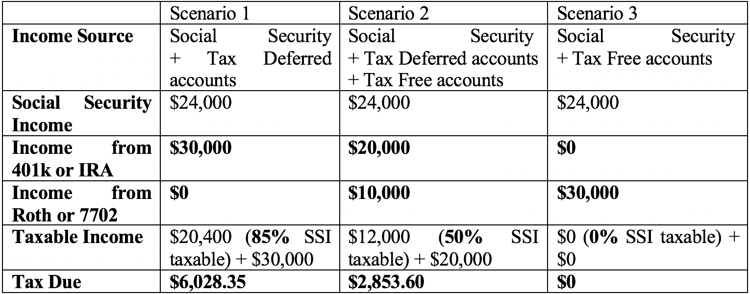From the calculation, you can tell that whether you utilizing plans like 410k/IRA/Roth-IRA/7702 makes an enormous difference, in terms of the taxes you need to pay. The reason lies in the different tax status brought by your asset/income source : income from 410(k) or traditional IRA is tax-deferred, while income from Roth IRA or 7702 is tax-exempt (tax advantage).
